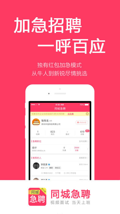 同城急聘app这是一个有用的招聘和求职应用程序。它为需要求职的用户提供了一个方便的求职平台,在这里聚集了大量的工作机会,并通过定位轻松找到周围的工作机会。快速高效的求职来到同一个城市。